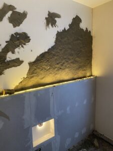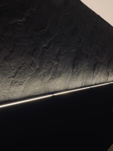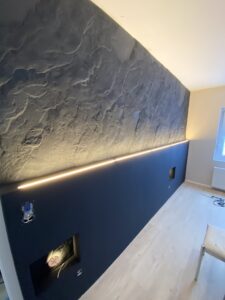 Gestaltung einer Schlafzimmerwand in zeitloser Natursteinoptik mit Ambientebeleuchtung.